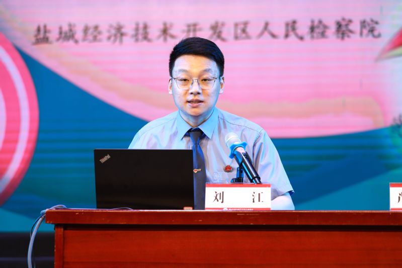 活动特邀盐城经济技术开发区人民检察院未检负责人刘江检察官开展法治宣传讲座。刘江以“青春一点通 护航共成长” 为题,从《民法典》编纂历程、内容架构讲起,结合案例深入浅出讲解其对未成年人权益保护的亮点,让师生对《民法典》有了更深入认知。