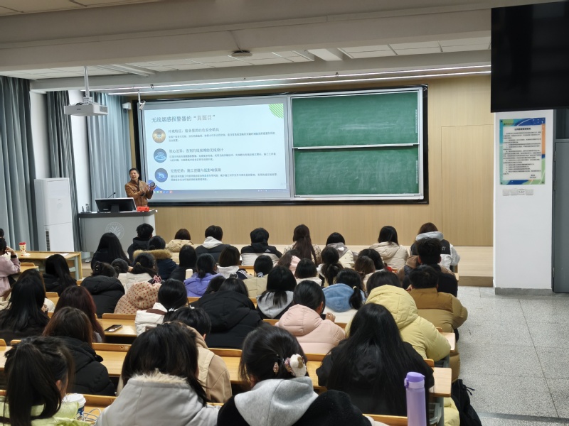 讲座伊始,严东处长以“安全是校园生命线” 为切入点,结合校园安全工作实际,用通俗易懂的语言拉开授课序幕。他通过实物图示与原理动画相结合的方式,详细介绍了无线烟感报警系统核心特点。针对师生关心的报警响应问题,他系统讲解了 “核实判断-分类处置 -有序疏散”的三步应对法,明确误报警时需通过开窗通风、长按消音键处理,严禁遮挡或破坏设备,真实火情时则坚持 生命第一 原则,采取弯腰低姿、湿毛巾捂口鼻等正确逃生方式。